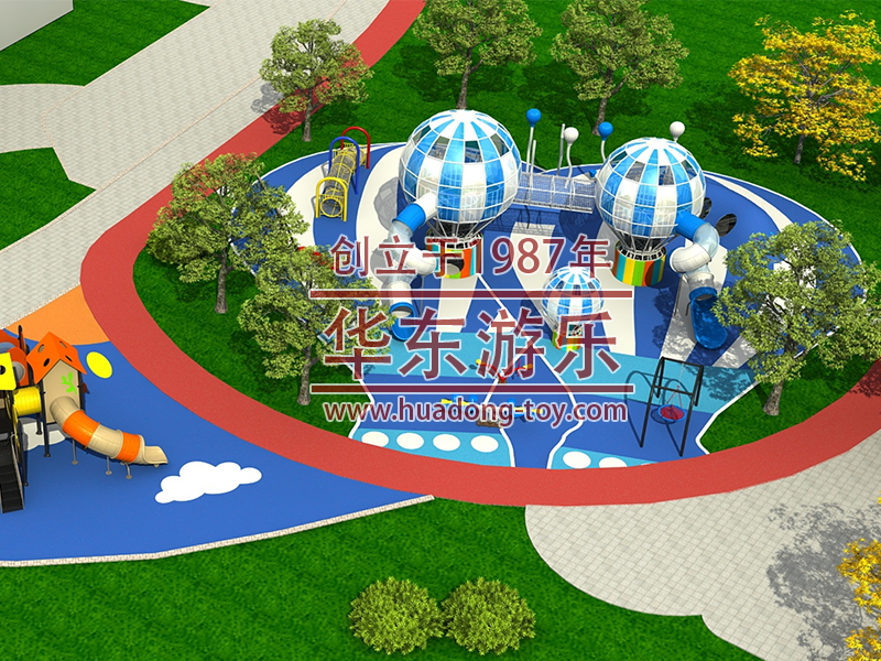 该项目采用的是以热气球为设计思路而设计的游乐场,场内设计了爬网,大型滑梯组合,秋千等等游乐设备。