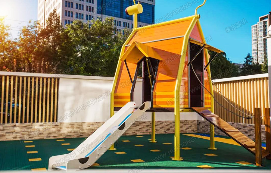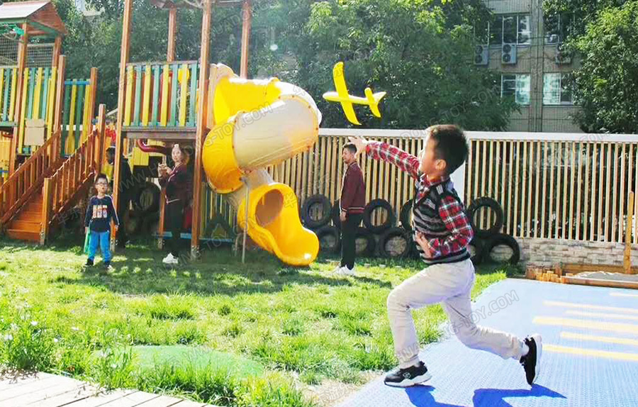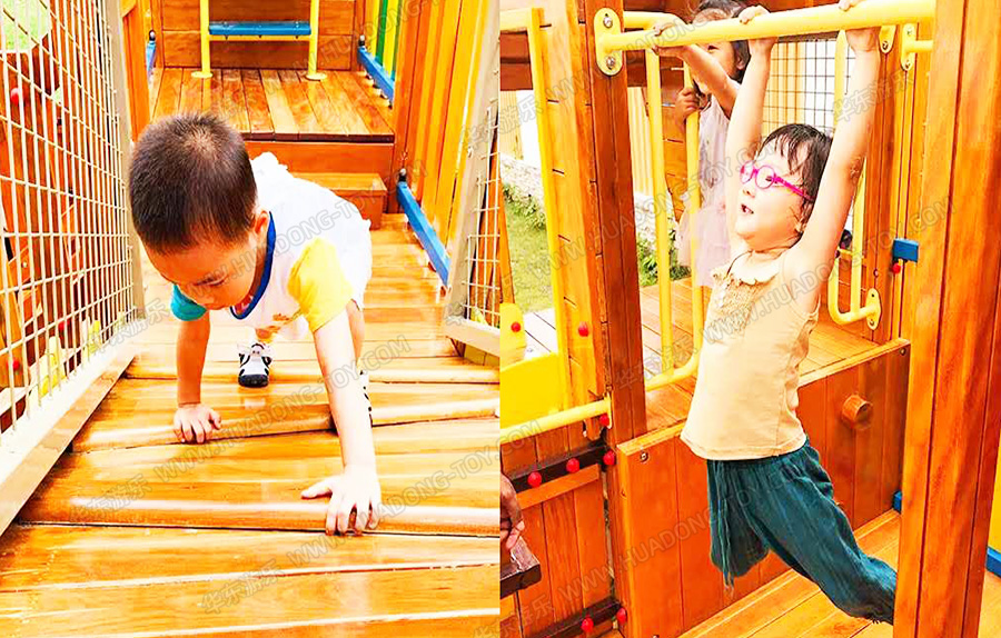 • 该幼儿园采用的是非标定制的木制产品,整套产品设计独特、颜色艳丽,非常美观的融入到整个幼儿园的娱乐场地,是集攀爬、滑梯、爬网、万能健身为一体的综合性游乐项目,让小朋友在玩耍的同时身体也得到了锻炼。