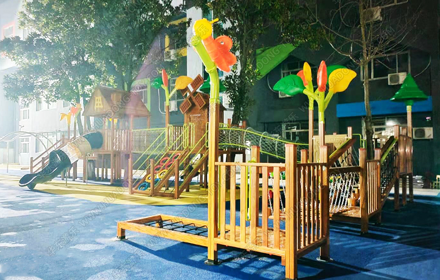 江苏省泰兴市育红幼儿园城西分校是经教育部批准的优秀幼儿园,该幼儿园此次采用的是乐鱼体育游乐生产的木制系列产品,具有爬网、攀爬、滑梯、脚踏水车、传声筒、钻洞等游乐设施。