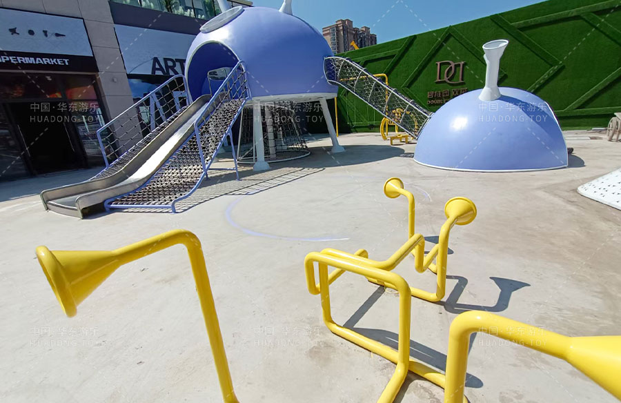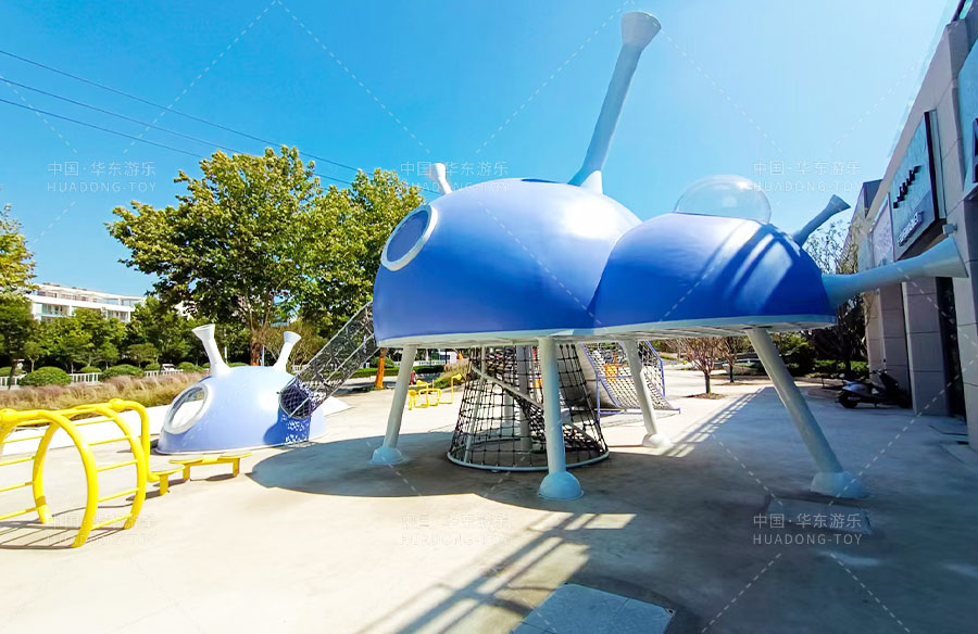 此次项目采用的是乐鱼体育游乐自主设计的飞碟主题的游乐设备,新增了传声筒、爬网、儿童秋千、钻洞、不锈钢滑梯等功能。